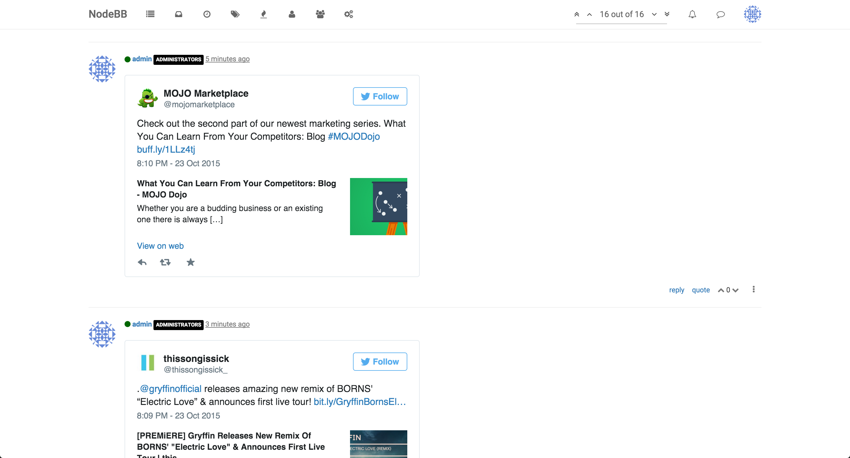 This NodeBB plugin allows users to embed tweets inline in their posts.