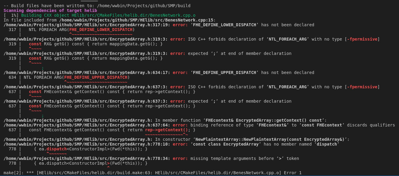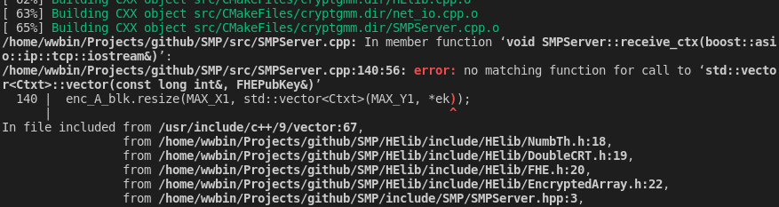 这是使用git submodule init && git submodule update添加子模块出现的问题,同时我也试过,直接clone作者在SMP中提供的HElib版本,做法:在SMP文件路径下运行git clone https://github.com/fionser/HElib.git。但是也出现了问题: