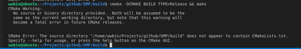 于是我自己修改了一下cmake命令,我认为它是因为找不到cmakelist.txt,所以我给它指定了cmakelist.txt的位置,命令为:cmake -DCMAKE_BUILD_TYPE=Release .. && make