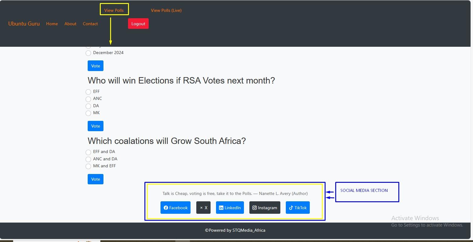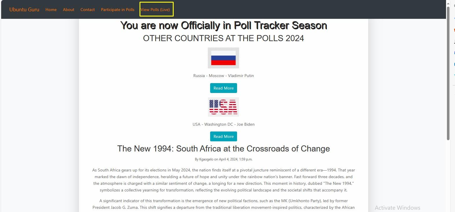 Ubuntu Guru is a Django-based web platform designed to foster interactive political engagement. It features a robust poll system that allows users to vote on various topics, track global election trends, and engage with political content interactively.