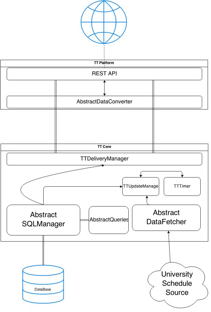 AbstractSQLManager- module that executes queries and works with storage: getting and putting department list, group list and timetables.AbstractQueries- definition of SQL queries, executed byAbstractSQLManagerimplementation. This allows different SQL providers usage.AbstractDataFetcher- module that works with parsing stuff: getting groups and departments from university, HTML parsing and temporary DB-friendly representation of them.TTDeliveryManager- module for unifying data between TT Core and TT Platform. It returns all the data from the database to clients with help of TT Platform.TTUpdateManagerandTTTimer- modules for replica maintaining. It checks and updates timetables, list of groups, department messages and departments list every day to keep it up to date. Also is responsible for dropping database each term.