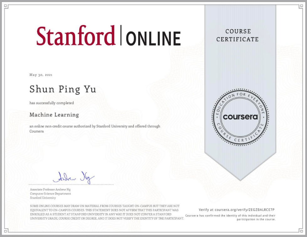 This course provides a broad introduction to machine learning, datamining, and statistical pattern recognition. Topics include: (i) Supervised learning (parametric/non-parametric algorithms, support vector machines, kernels, neural networks). (ii) Unsupervised learning (clustering, dimensionality reduction, recommender systems, deep learning). (iii) Best practices in machine learning (bias/variance theory; innovation process in machine learning and AI). The course will also draw from numerous case studies and applications, so that you'll also learn how to apply learning algorithms to building smart robots (perception, control), text understanding (web search, anti-spam), computer vision, medical informatics, audio, database mining, and other areas.