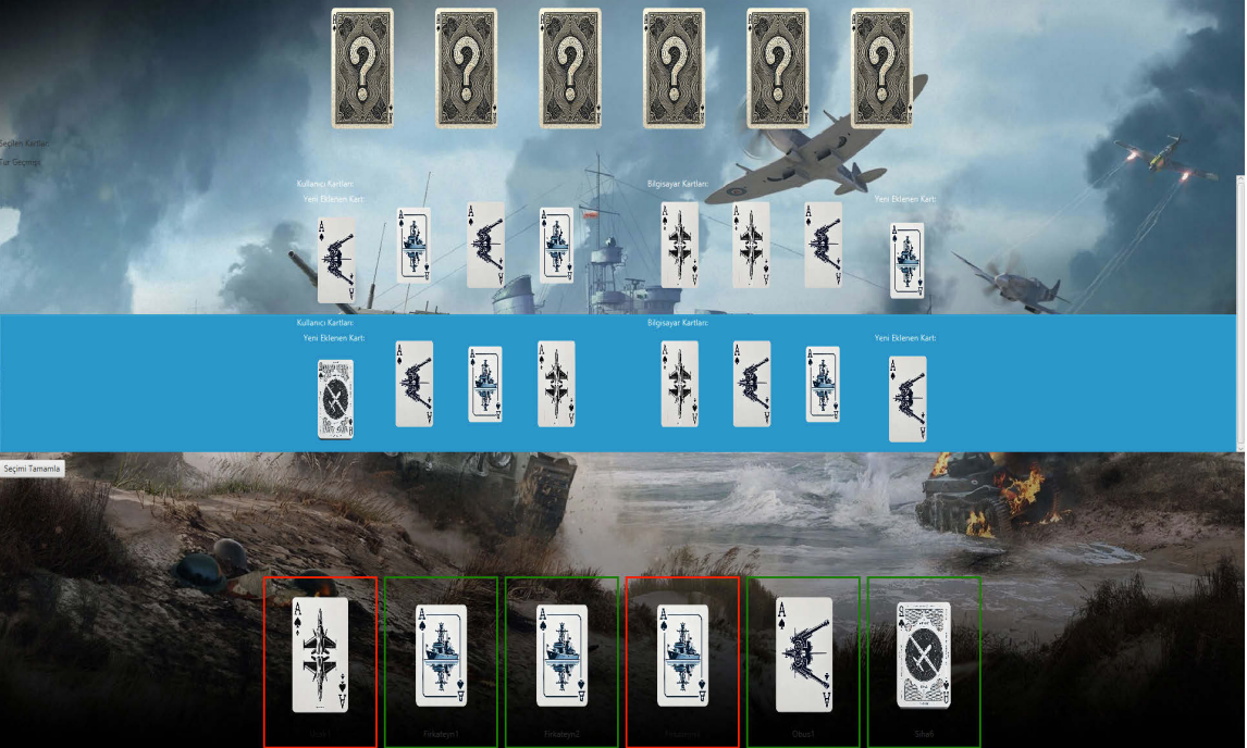 There are 6 cards in total in the game and each card has its own properties. 3 of these cards are locked at the beginning of the game. They are unlocked according to your team's level score in the later stages of the game. These features are hitting advantage, durability, hitting power. The user can view these features by pressing the "Card Information" button on the home screen of the game. When the user presses the Start Game button, the game asks the user to enter a number of rounds and the game starts. At the beginning of the game, 6 cards are randomly assigned to the user and the opposite computer, and the player cannot see the cards of the opposite computer. When the round starts, the user is expected to choose 3 of the cards in her/his hand and press the "Complete Selection" Button. The round is played and the players' chosen cards are pitted against the computer's chosen cards. There may be cards whose durability has decreased or expired as a result of the battle. Cards whose durability is exhausted are removed from the deck. Each card has its own level point, and you gain the level point of the card you kill for your team. If your team passes a certain level score, the 3 card types that were initially locked will be unlocked and so a random card added each round can be one of the 3 cards unlocked. At the end of the round, each side is given 1 random card. Cards played each round can be viewed from the "Tour History" tab in the middle.When a new round begins, the user is asked to choose cards different from the cards he/she selected in the previous round. When the number of rounds is completed or when either side has no cards left, the game ends and the winner is determined.