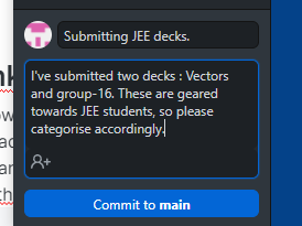 github.com/Demo-User-42069, and you want to contribute two decks, namelyInorganic Group-16 NCERTandVectors JEE, both meant for JEE aspirants, then this is what your structure more or less should look like :Please don't put your contributions under any other section, otherwise they'll get overwritten by updates.