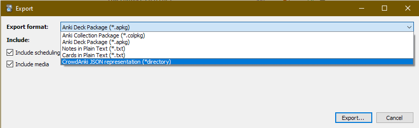CrowdAnki JSON representation (*directory) - Make sure all settings look exactly like the image below, then hit