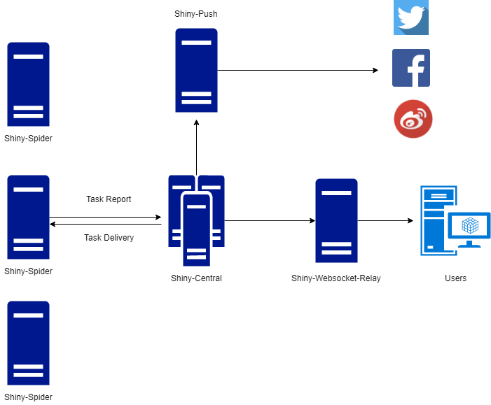 本项目含一个中央控制节点(Node.js,下称作中控),若干爬虫结点(Python,下称爬虫)以及一个消息转发结点(Node.js,下称转发)。