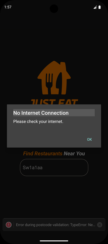 handleSearchfunction has a timeout built-in. If postcode validation takes too long (e.g., due to network issues), the app doesn’t hang; it moves on and tries fetching restaurant data from Just Eat. -