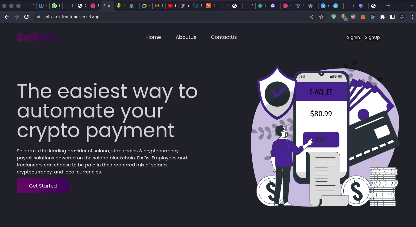 SolEarn is a decentralized crypto payroll application built on Solana blockchain that allows businesses to pay their employees in cryptocurrencies. SolEarn provides a fast and secure way to conduct transactions with low fees. This documentation provides a comprehensive overview of the solution, its MVP, interaction, architecture, and future improvements.