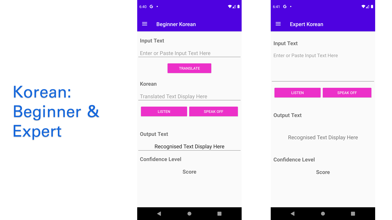 Language Master is a Android App for learning Japanese and Korean. This Language Master App mimics how children learn native languages by listening and speaking. It helps users learn Japanese and Korean from beginner to expert levels. This App uses Google Translate, Google Text-to-Speech (TTS) and Google Speech Recognizer in Java done in Android Studio.