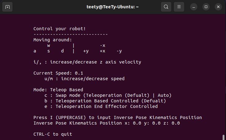 ros2 run robotics_model_3dof teleop_keyboard.py If your teleop_keyboard open correctly at launch file terminal will show Tele-operation Mode