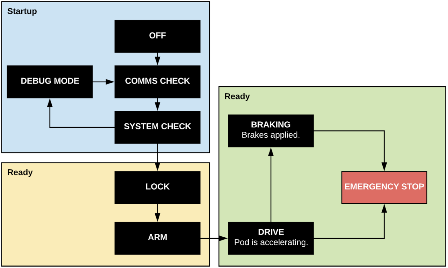 At a high level, we'll be building logic that lets the pod cycle between these states. This should (for now) give it everything it needs to handle startup, accelerating, maintaining state, and braking on a straight sprint.