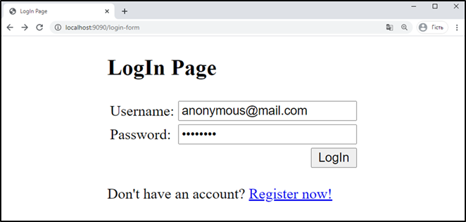 - If the user has not yet logged in, then after visiting any page redirect him to the login page, which is available at URL "/form-login". The login form should include fields for entering login and password, and the button “LogIn”. As the “username” for login, use the user’s email.