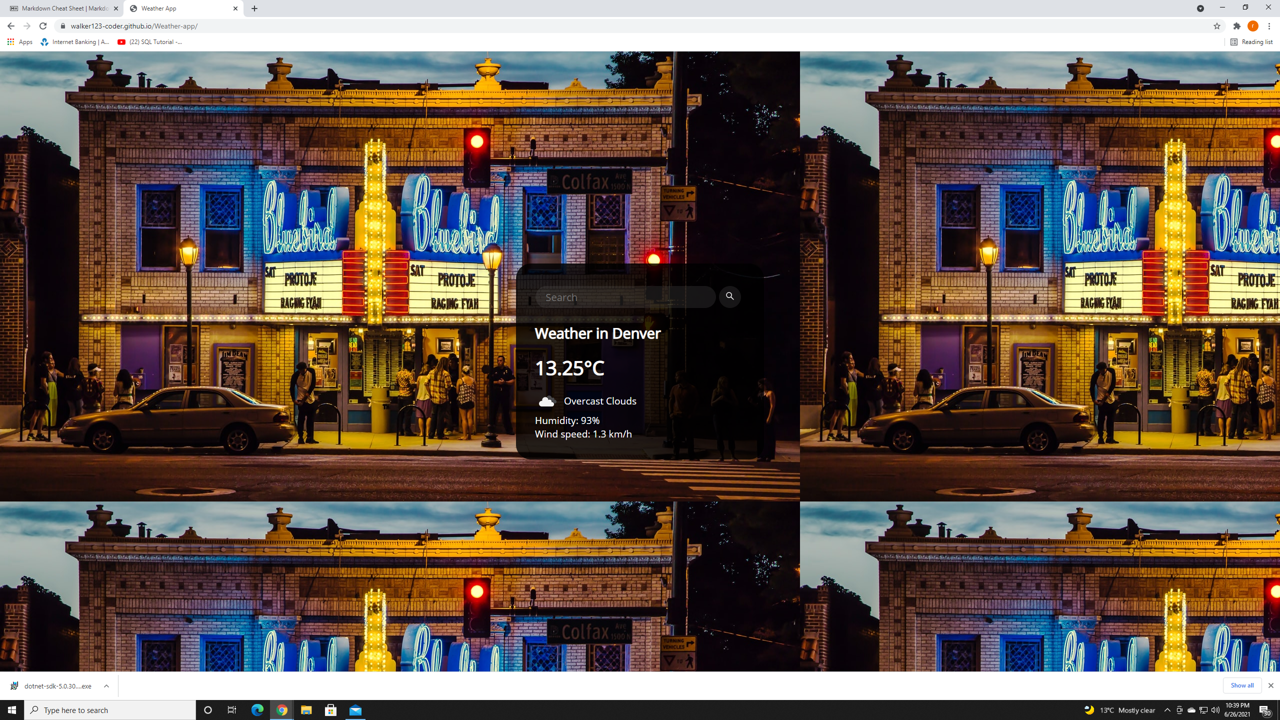 - When opening the web app you will be presented with a search bar and back ground images relating to default location denver.