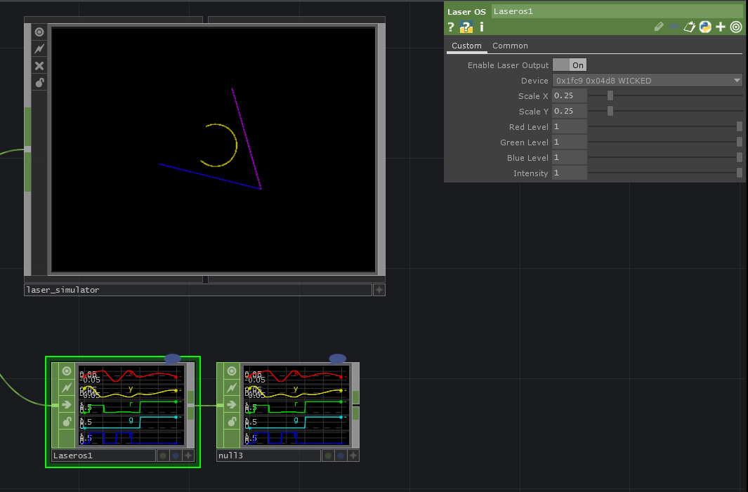 - If you look around you will see the network that creates a circle inside a triangle, and causes the scene to rotate, and then output to the laser. In the lower right, look for the Laseros1 Operator and select it. You should see the properties window in the upper right, press P on the keyboard if you don't see it. Select your Laser OS device and use the toggle to Enable Laser Output when it is safe to do so.