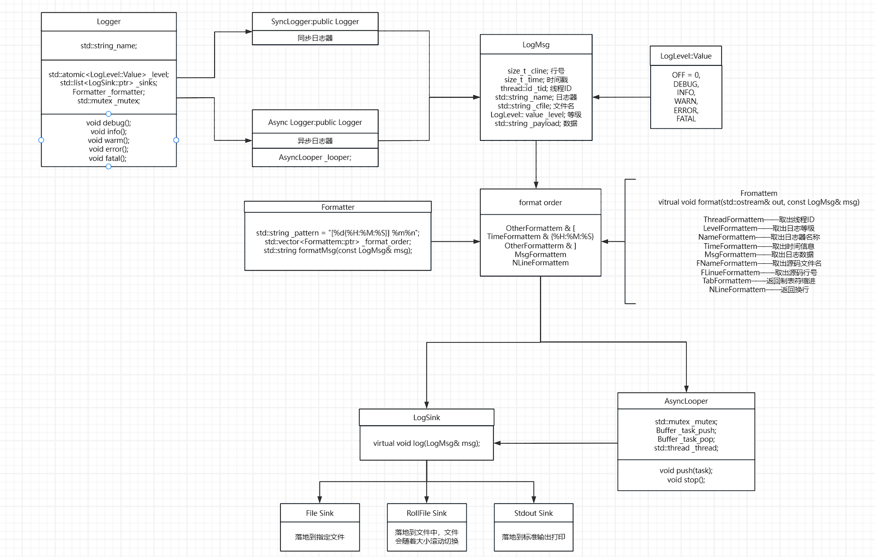 - 日志器模块:对上面模块的整合、日志输出等级、日志信息格式化、日志消息落地模块