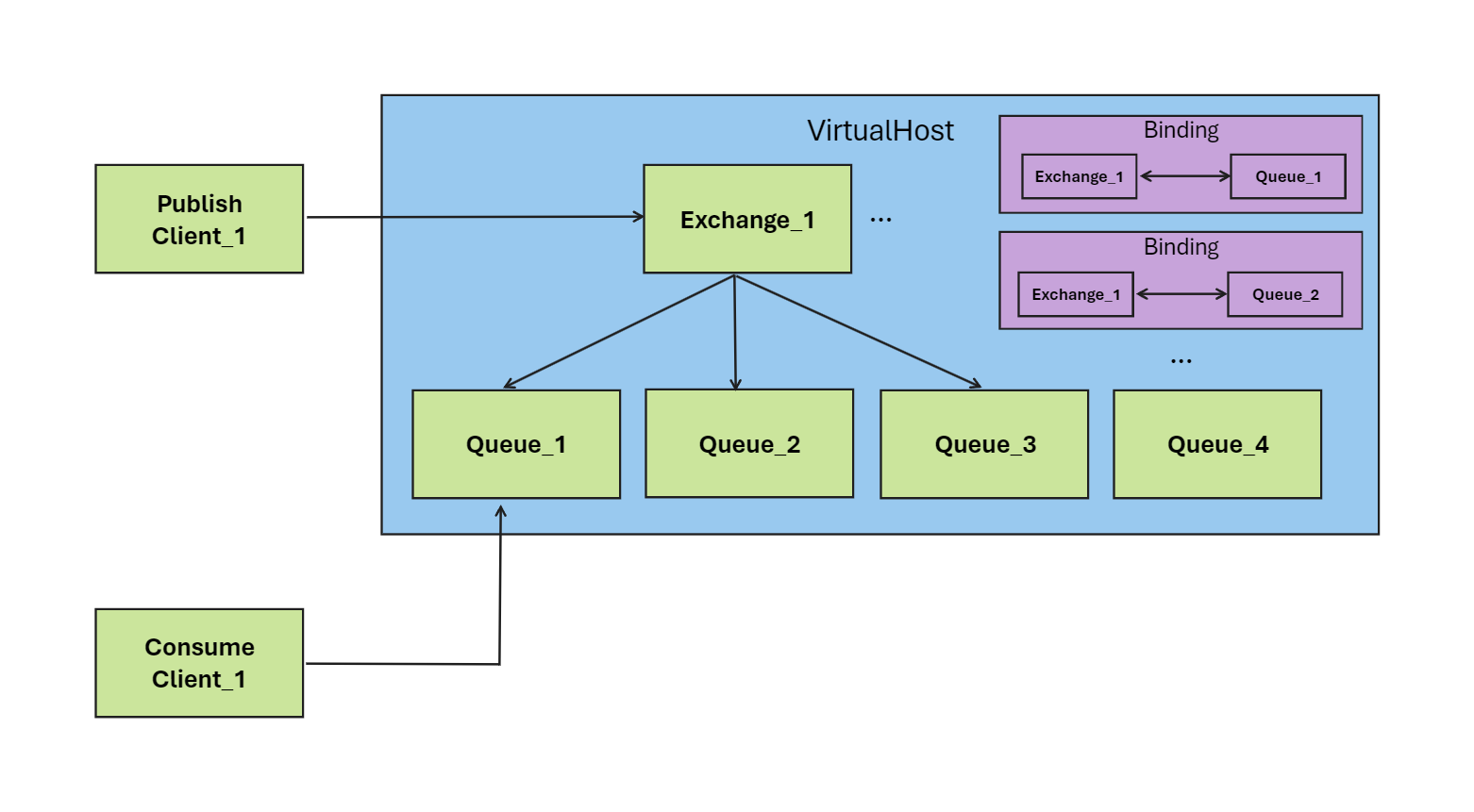 绑定-Binding: Exchange和Queue之间的关联关系, 他们之间是多对多的关系, 使用一个关联表将这两个概念连接起来