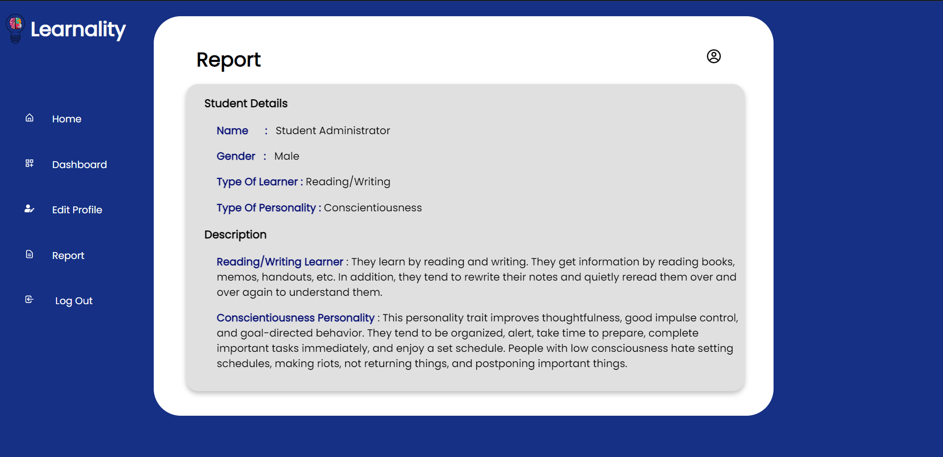 Teachers struggle to recognize and differentiate pupils based on their learning styles. Researchers devised a plan to assess students' learning styles and personality types. Students may learn about their personalities and play to their strengths and weaknesses with the help of this project. The "Learnality" initiative will provide learning resources for both parties.