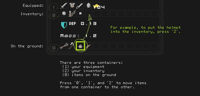 then press 1 to put it on, 2 to put it in the inventory, or 0 to drop it on the ground.