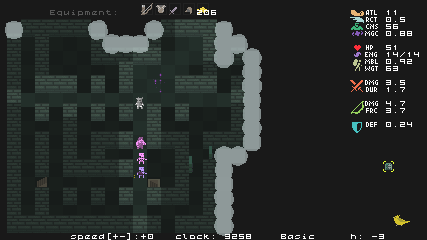The game is quite different from many Roguelikes and RPG games. First of all, the time system is semi-continuous: Your discrete actions are simulated in the continuous space and time, so you get interesting combat mechanics with a lot of pushing and dodging, while largely preserving the feel of familiar grid based games.