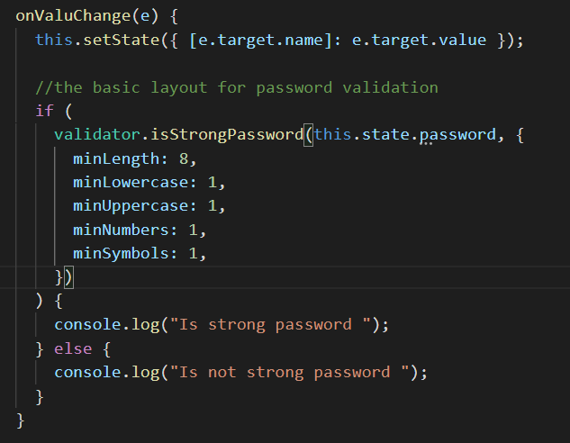 Made a template for password validator using validator package. the template has console-logs, which can be replaced with possible endpoints(or redirects or functions). Used validator node package.