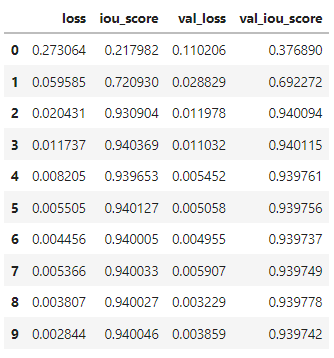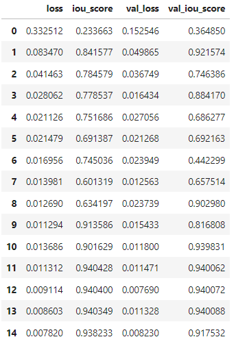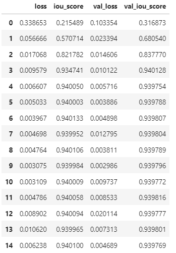 Notes: The model's val_iou_score seems to get stable at 0.939 with higher epochs.