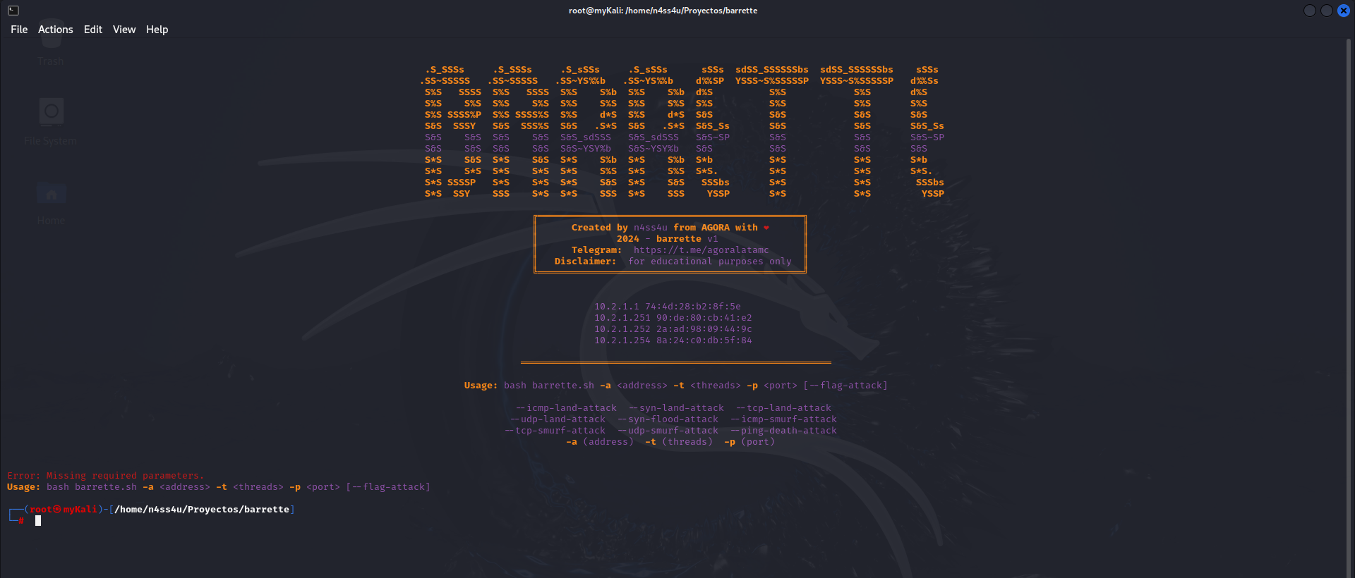 bash barrette.sh -a IP_OBJETIVO -t NUMERO_DE_HILOS -p PUERTO --TIPO-DE-ATAQUE