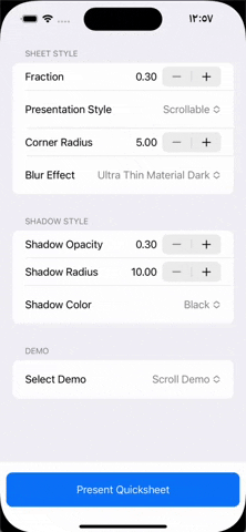 fraction: Represents the height of the sheet as a percentage of the screen heightpresentationStyle: The sheet's presentation style; regular, expandable or scrollable.cornerRadius: Changing this value determines the radius of the top left and right cornersblurEffect: Choose a background effect from a system-defined listUIBlurEffect.Style. Setting this to nil removes the blur effect and replaces it with a 75% opaque black backgroundshadowStyle: Determines the shadow style of the pop-up. Set to.standardto use the default configuration or create your ownQuickSheetOptions.ShadowStyleconstant as follows