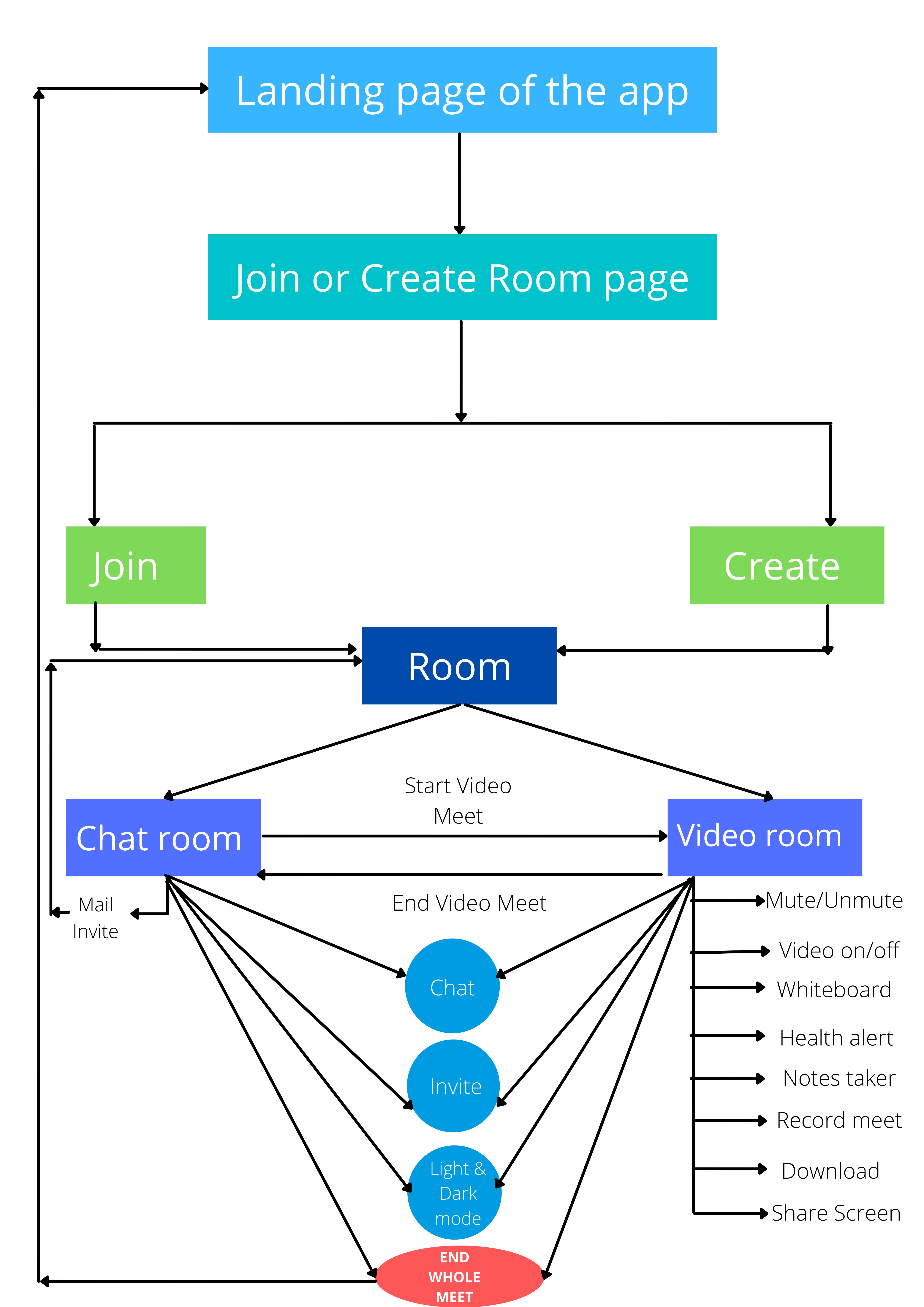 - Sprint 3: Built in more complex features into the app such as share screen, record and download video, collaborative whiteboard and icebreaker and further improved the UI. The clear whiteboard has not been kept collaborative so that users in the meet do not miss out on something important if a user erases the whole board without warning. An alert is sent to all users instead to wrap up the current discussion and clear the boards from their ends.
