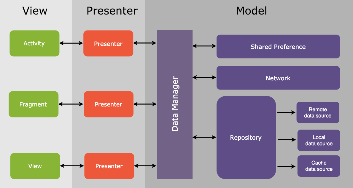 - Using base abstract classes to support MVP methodology while avoiding Activity leaks by releasing the view when it's no longer needed ,BasePresenter repsonsable to destroy the view onDestroy().