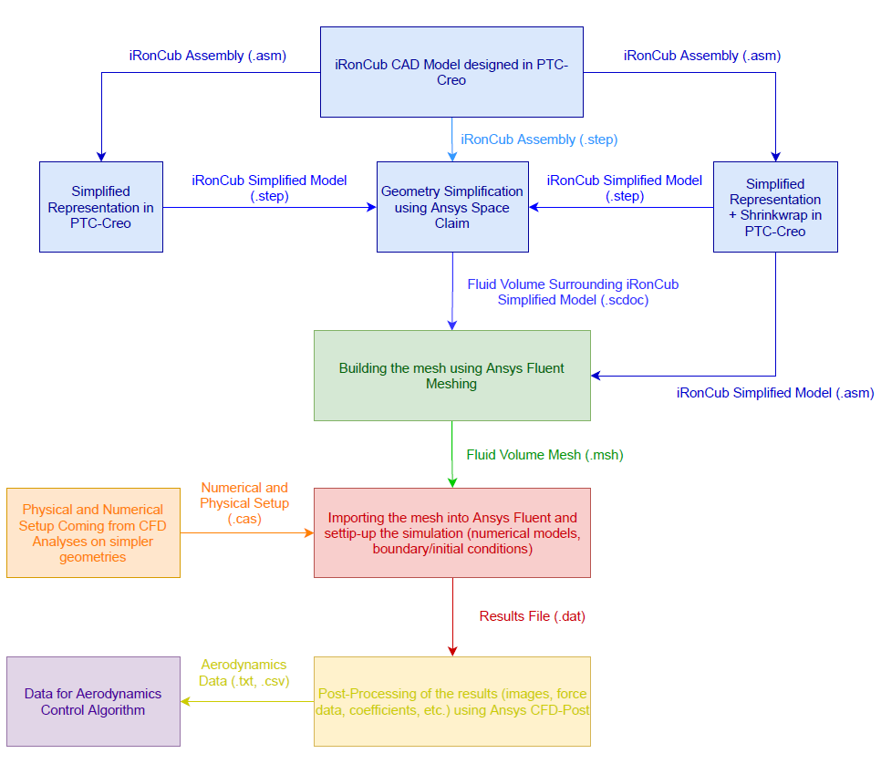 Using Ansys Workbench (and specifically Ansys Fluent for CFD simulations), the main objective of this project is to develop a procedure which, starting from one CAD model of iRonCub, is able to give as output the aerodynamic forces acting on it.