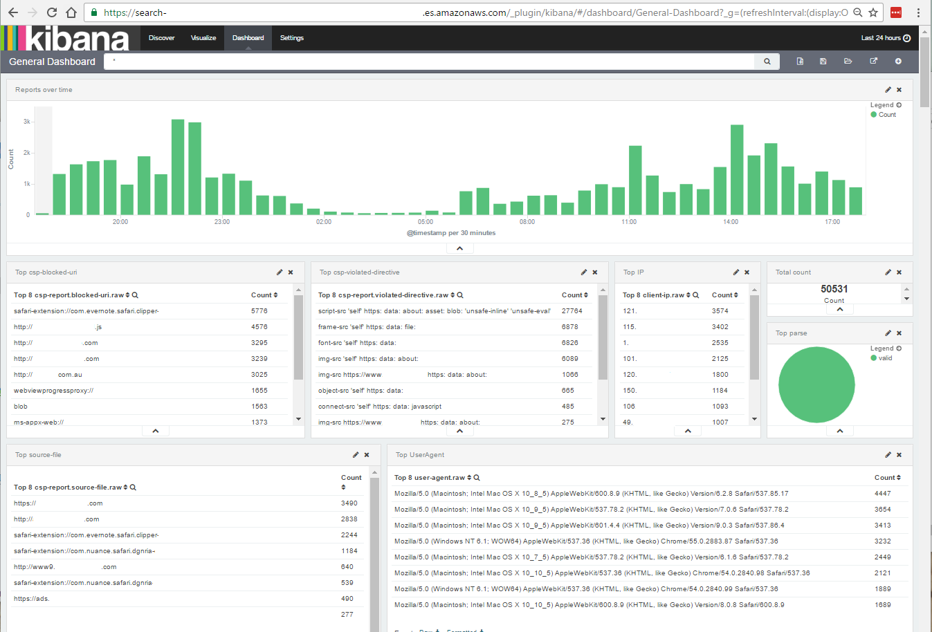 node ./nodejs/server.jsThis way the Node.js appliation will listen in the configured port and process POST requests containing CSP reports. Each POST will be sent to Elasticsearch into indices named cspdata-YYYYMMDD