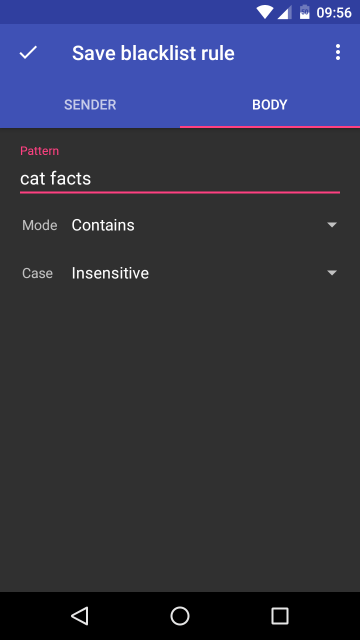 Next, enter the keyword(s) that you want to block in the Pattern textbox. Here, I have entered cat facts, but you can type whatever you want, of course.