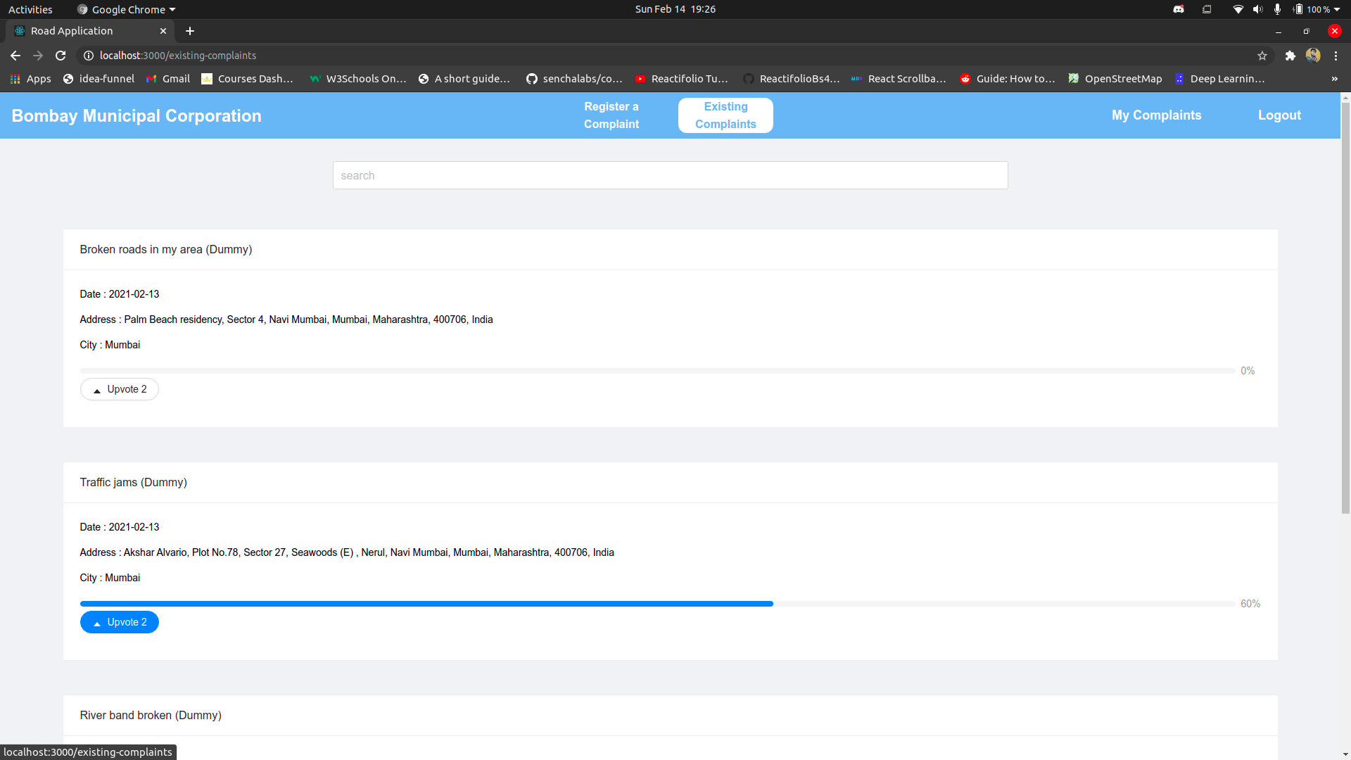 The general citizen can view all the complaints under Existing Complaints section registered by other citizens, and he has the choice to upvote their issues if he finds them relevant. He can also view the status of his own complaints under My Complaints section. You also have the option to search for any existing complaint.