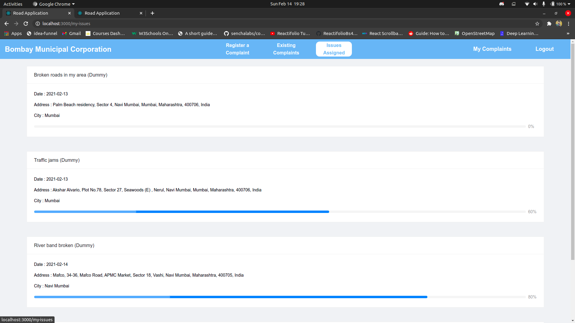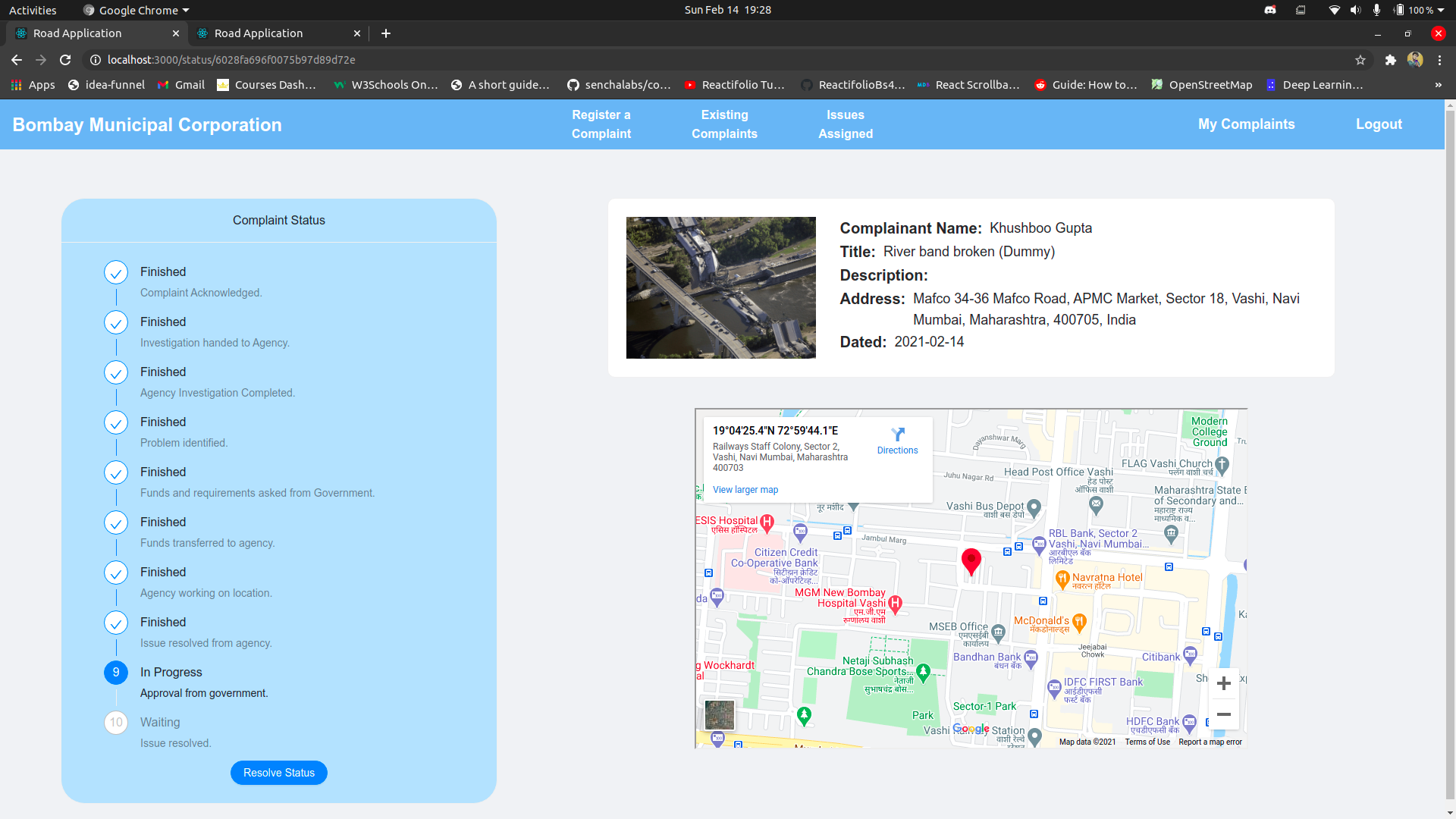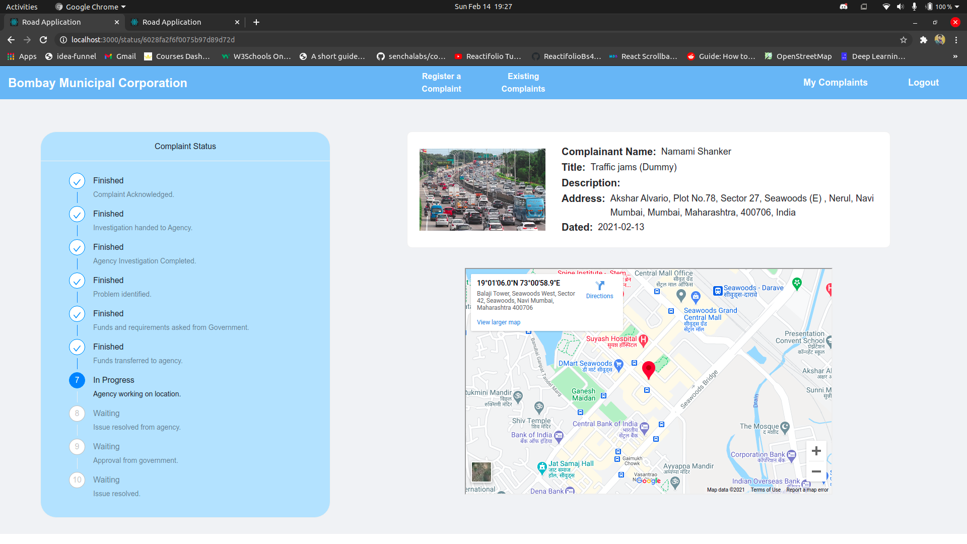 By clicking on any complaint you can view its details such as its location on Google Maps which is obtained using Geocoding using Puppeteer and its status on its way to being resolved.