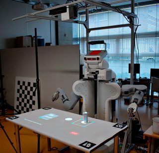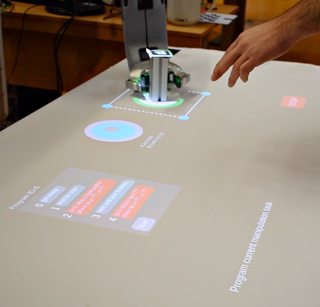 The video below shows how operator uses touch sensitive table and augmented reality interface to set parameters of a program consisting of two pick and place tasks. For each task, the operator sets object type to be picked up, area from which objects of that type should be picked and location on the table where the robot (PR2) should place them.