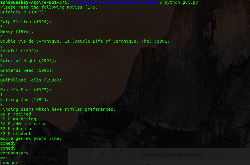 Now input the ratings from 1 to 5 of the displayed movies and the output will be the type of people with whom your movie tastes matches and you'll get your genre recomendations