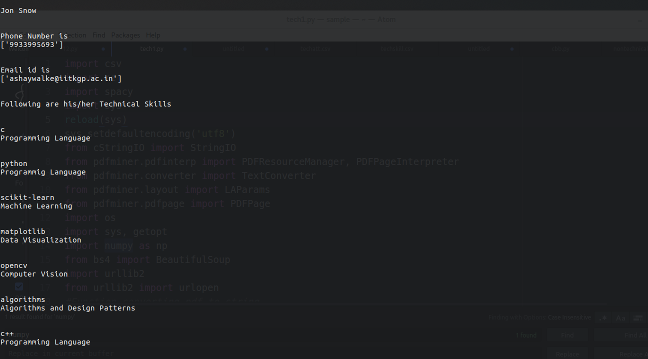 Code to parse information such as Name, Email, Phone Number, skillset and the technology associated with it.