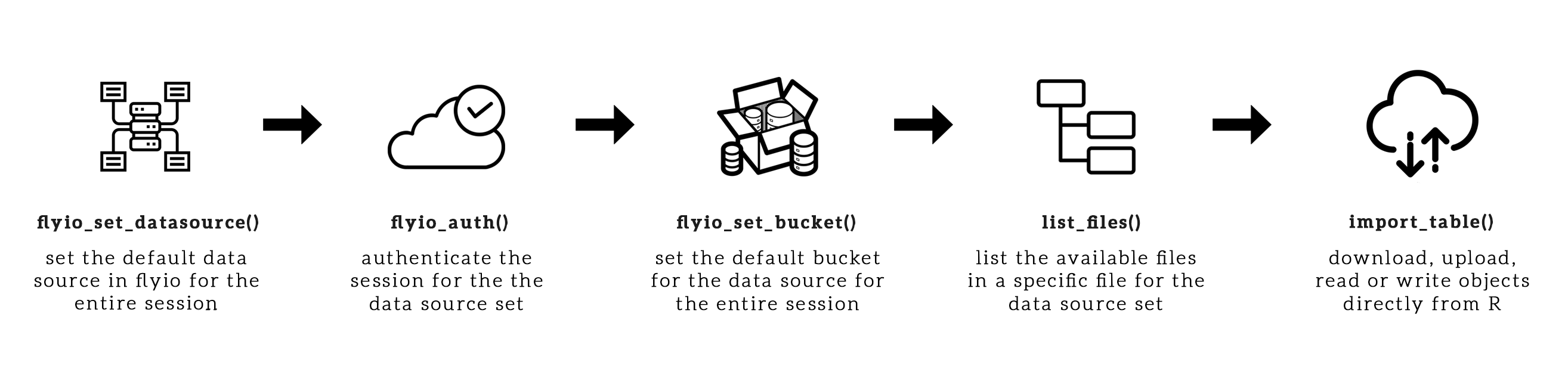 flyio_set_datasource(): Set the data source (GCS, S3 or local) for all the other functions in flyio.flyio_auth(): Authenticate data source (GCS or S3) so that you have access to the data. In a single session, different data sources can be authenticated.flyio_set_bucket(): Set the bucket name once for any or both data sources so that you don't need to write it in each function.list_files(): List the files in the bucket/folder.file_exists(): Check if a file exists in the bucket/folder.export_[file/folder](): Upload a file/folder to S3 or GCS from R.import_file(): Download a file from S3 or GCS.import_[table/raster/stack/shp/rds/rda/st](): Read a file from the set data source and bucket from a user-defined function.export_[table/raster/shp/rds/rda/st](): Write a file to the set data source and bucket from a user-defined function.
