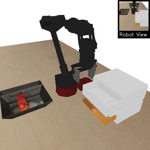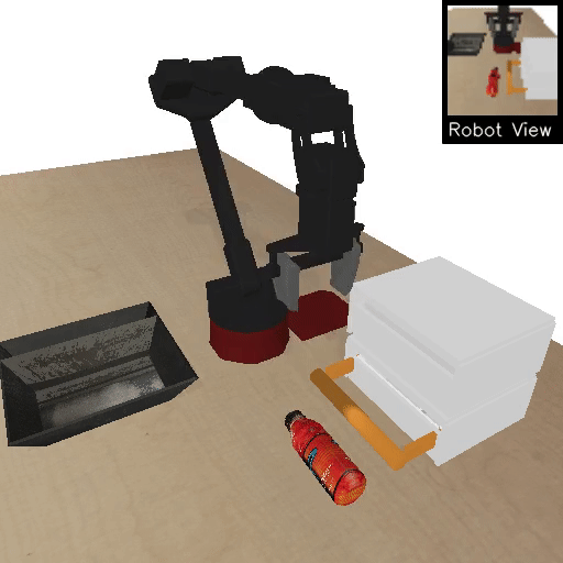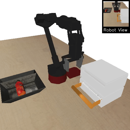 | Open drawer, take object out | Close top drawer, take object out | Remove obstacle, take object out |