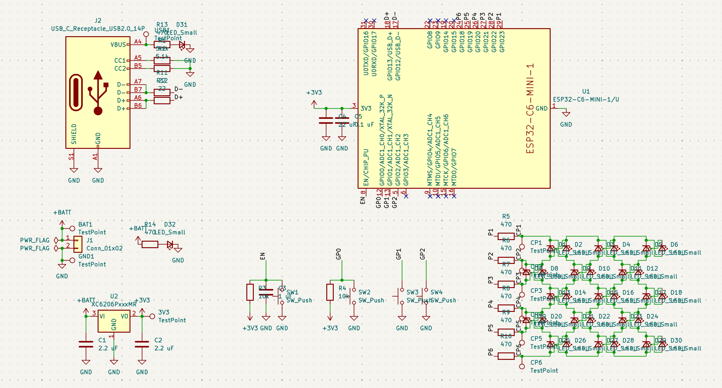 This is intended to both be a standalone board (with two buttons as inputs) and a test of these specific components for use in more ambitious future projects. Additionally, charlieplexing was a new concept for me, which is why I wanted to first try it out in this format. The ESP32 was selected for its compatibility with Arduino firmware, especially having had previous experience working with the microcontroller. Six GPIO pins are allocated for the matrix, and through charlieplexing, the board controls 30 LEDs (6×5). The included firmware provides an API for controlling the matrix through a multiplexing routine.