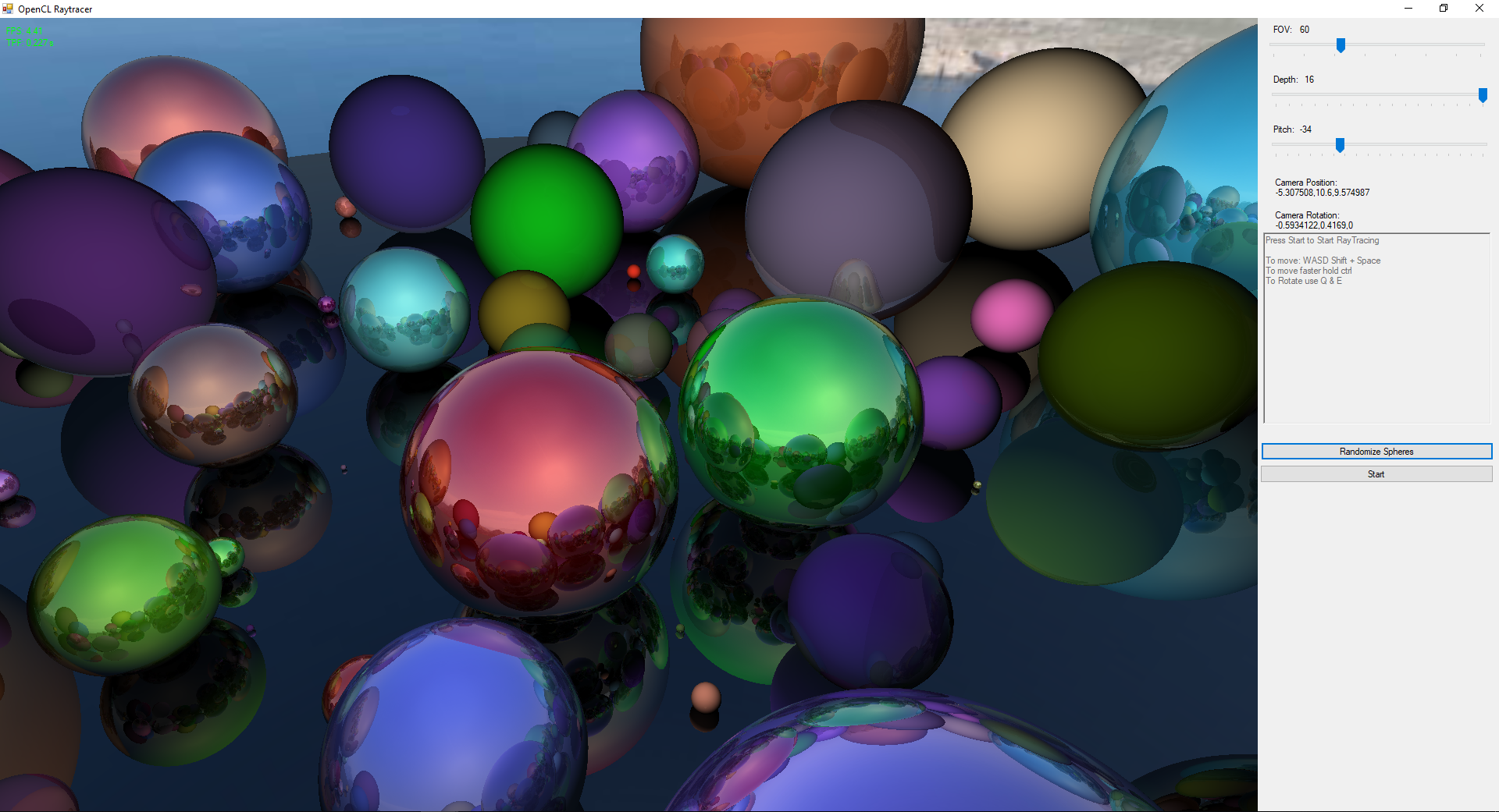 This repo contains the code for a Raytracer written in C# using Windows Forms. Raytracing is highly parallelizable task so allowing the code to run on the GPU, using OpenCL, was a necessity for fast realtime results. The ray tracer supports backgrounds, spheres, disks, reflections, and refractions.