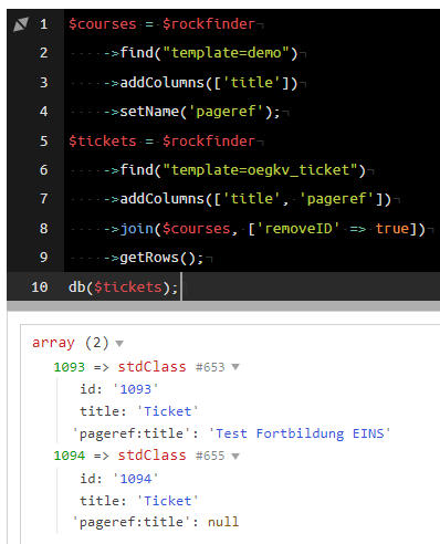 db($finder->relations->first());NOTE Look at the result of the kittens finder: It returned three rows as result even though we did not define any limit on the initial setup of that finder! That is because RockFinder will automatically return only the rows of the relation that are listed in the column of the main finder!