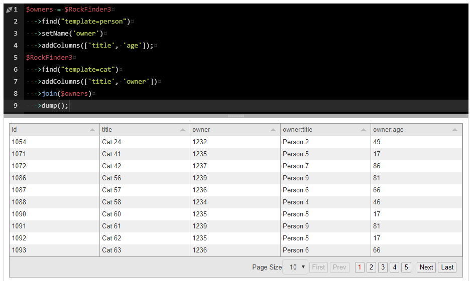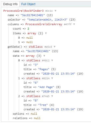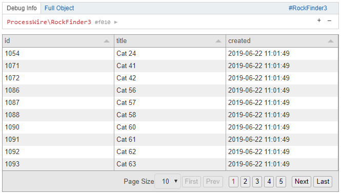 For small finders Tracy's dump() feature is enough, but if you have more complex finders or you have thousands of pages this might get really inconvenient. That's why RockFinder3 ships with a custom dump() method that works in the tracy console and turns the result of the finder into a paginated table (using tabulator.info).