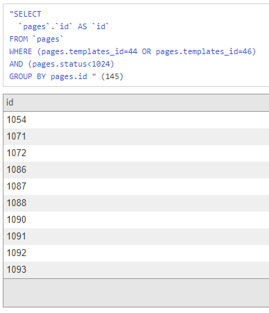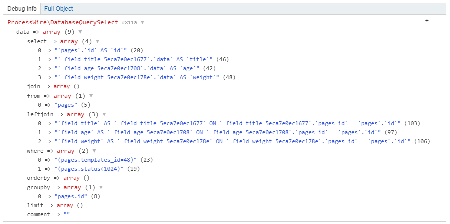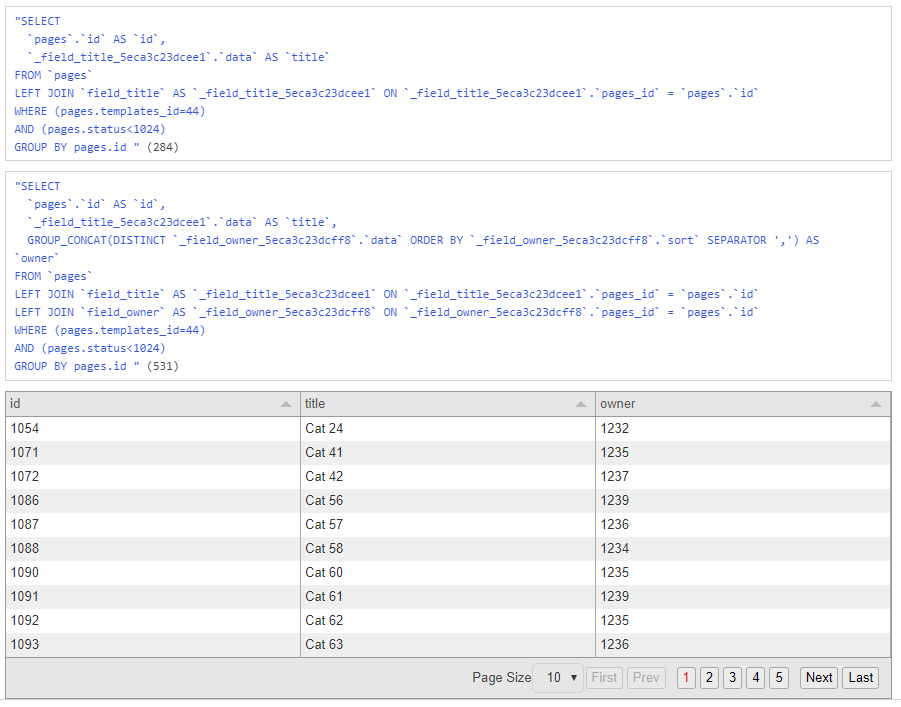 $rf->dump();Wait... That's not what we expected, right? That's because we still have the pages.id column in our SELECT and GROUP BY statement and therefore we end up with all the cats and dogs as unique rows. To get rid of that column we make one important change: Instead of adding the SELECT and GROUP BY statement to the query we overwrite them: