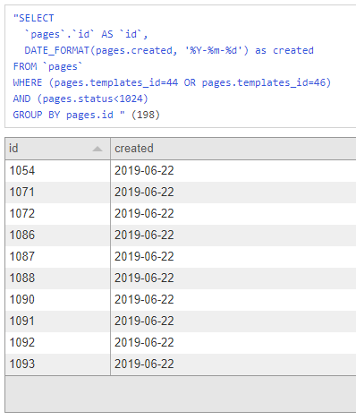 $rf->dump();We can't simply add the created column because this is a timestamp. We need a formatted date, so we add it as custom SQL: