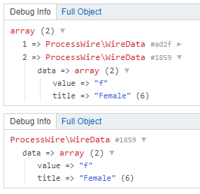 ->dump();In case of the Options Fieldtype we have a title and a value entry for each option. That's why RockFinder ships with two custom columnTypes that query those values directly from the DB (thanks to a PR from David Karich @RockFinder2). You can even get both values in one single query: