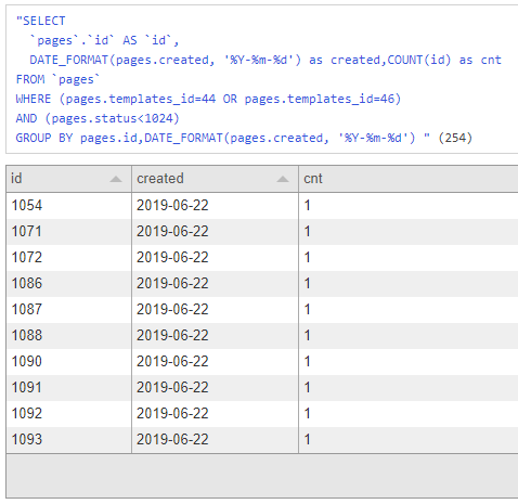 "DATE_FORMAT(pages.created, '%Y-%m-%d')",