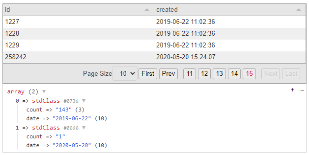 $rf->dump();Great! Now we need to group the result by the date string: