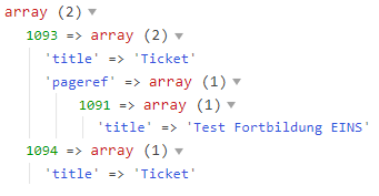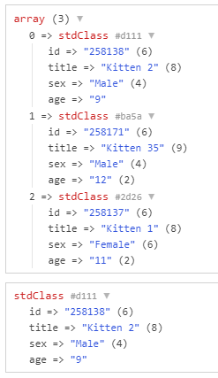 ->dump();So, how do we get data of those referenced pages? We might want to list the name of the kitten (the title field). This could be done in a similar way as we did on the options field above. But what if we also wanted to show other field data of that kitten, like the sex and age? It would get really difficult to show all that informations in one single cell of output!